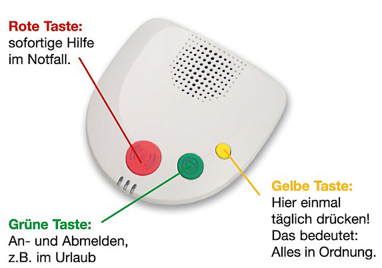 Sie benötigen lediglich die sogenannte Basisstation zusätzlich zu Ihrem Telefon, diese ist nicht viel größer als das Telefon selbst. Alle Tasten sind hinterleuchtet und können über fühlbare Piktogramme ertastet werden. Die Teilnehmerstation wird durch den mobilen Funksender ergänzt, der so klein ist, dass Sie ihn bequem am Handgelenk oder wie eine Kette um den Hals tragen können. Notrufe können ausgelöst werden durch die Notruftaste, den mobilen Funksender, die Sicherheitsuhr (wenn die gelbe Taste über einen bestimmten Zeitraum hinaus nicht gedrückt wird), aber auch durch Sensoren wie Funk-Rauchmelder, Funk-Bewegungsmelder oder Funk-Kontaktmelder.